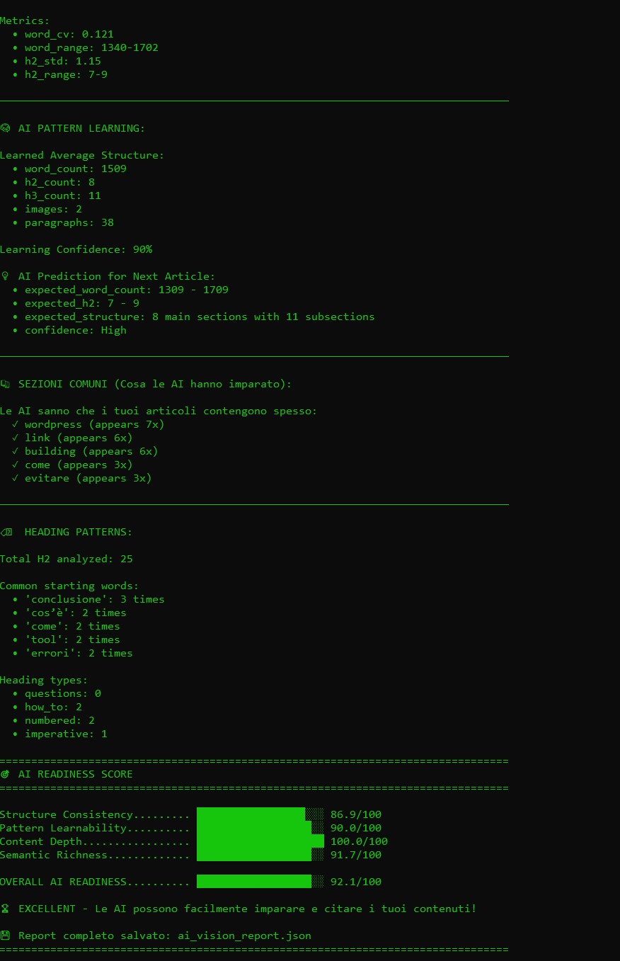 L’AI Vision Analyzer valuta quanto facilmente le intelligenze artificiali possano “imparare” la struttura del blog e citarne i contenuti: